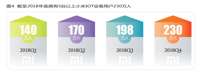 财报数据显示,截至2018年年末,拥有5台以上小米IOT设备(不包括智能手机及笔记本电脑)的用户数近230万,环比增长16.2%,同比增长109.5%(图4)。IOT平台连接全球智能设备达1.71亿台,环比增长13.7%,同比增长70%。