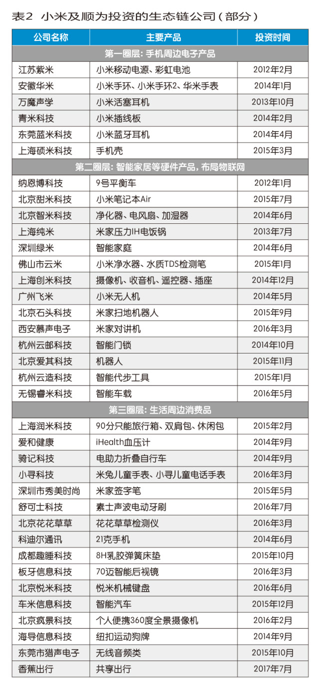 通过这些原则,截至2019年3月31日,小米集团建立起了包括逾270家公司的生态链,其中超过100家公司专注于研发智能硬件及生活消费产品(表2)。“致力于创造创新技术、高品质、精心设计、卓越用户体验与价格厚道的产品。”其年报中如此描述。