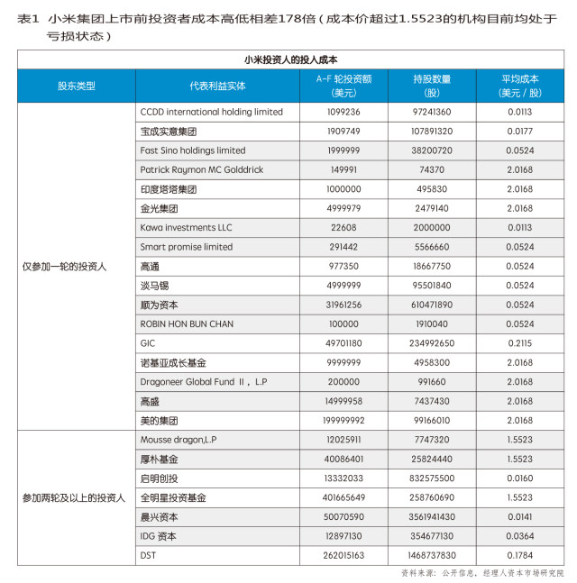 股价低迷不振,不仅IPO认购的投资人未能盈利,更别说像小米集团CEO雷军在公司上市时宣称的“赚一倍”,而且参与小米集团A-E轮融资的24家机构中,目前仍有10家机构处于亏损状态(表1)。